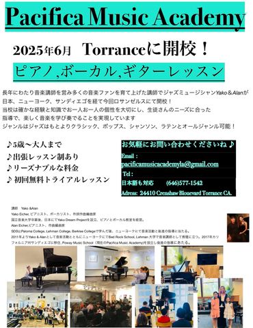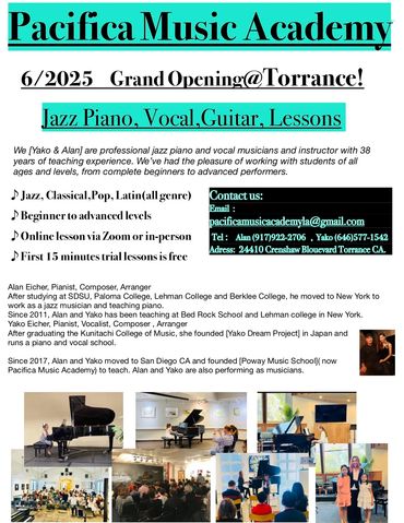 Vocal and Piano teacher Yako has over 25 years teaching experience teaching students of all ages and levels. She has a bachelors degree in Classical piano from Kunitachi College in Tokyo and has taught in Japan, New York, San Diego and now in Torrance Los Angelos.